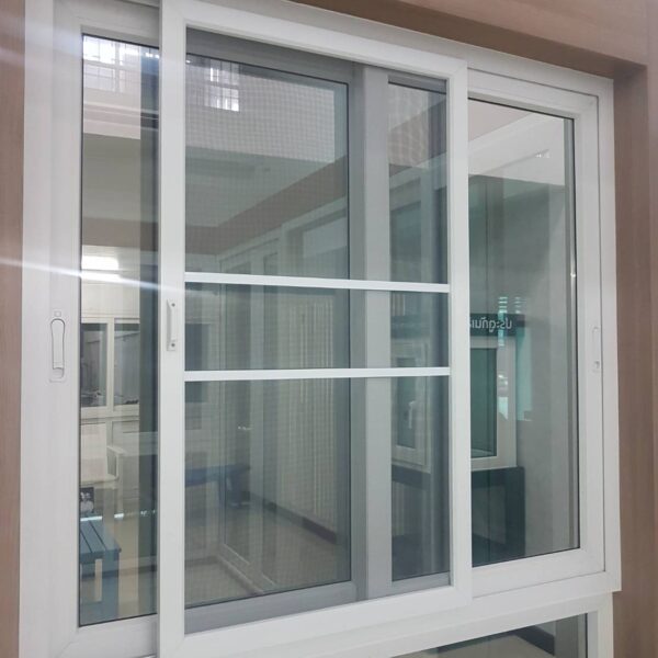 -กรอบมุ้งเป็นวัสดุ uPVC ผ้ามุ้งมีลักษณะเป็นแผ่นเรียบ มีเส้นเสริมกลางบานเพิ่มความแข็งแรง ล้อมุ้งไนล่อน ทำให้ไม่มีเสียงดังเวลาเลื่อน ใช้งานง่ายและไม่ตกราง สามารถถอดล้างทำความสะอาดได้