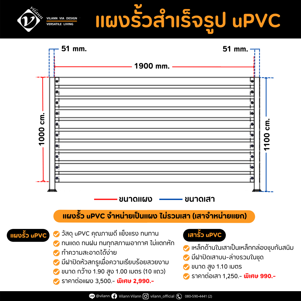 Vilann แผงรั้วสำเร็จรูป uPVC ขนาดแผง กว้าง 190 สูง 100 cm.
